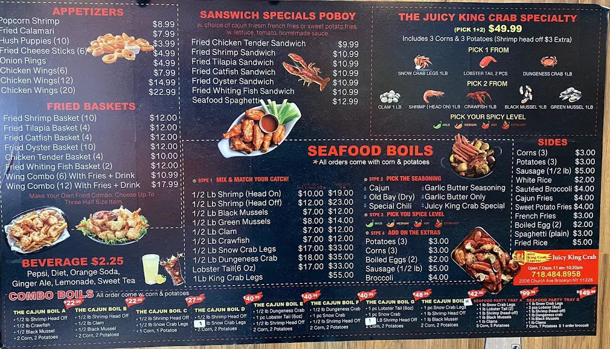 Stepping into the menu at Juicy King Crab Express Restaurant Menu feels a bit like cracking open a treasure chest of flavor. Located right on 2006 Church Ave in Brooklyn, this spot keeps things fun and unpretentious, offering plenty of seafood classics that hit the table bursting with personality. As you look through the selections, you’ll notice how easy it is to mix and match your favorites, whether you’re craving a simple fried basket or one of those saucy seafood boils that always grab attention.